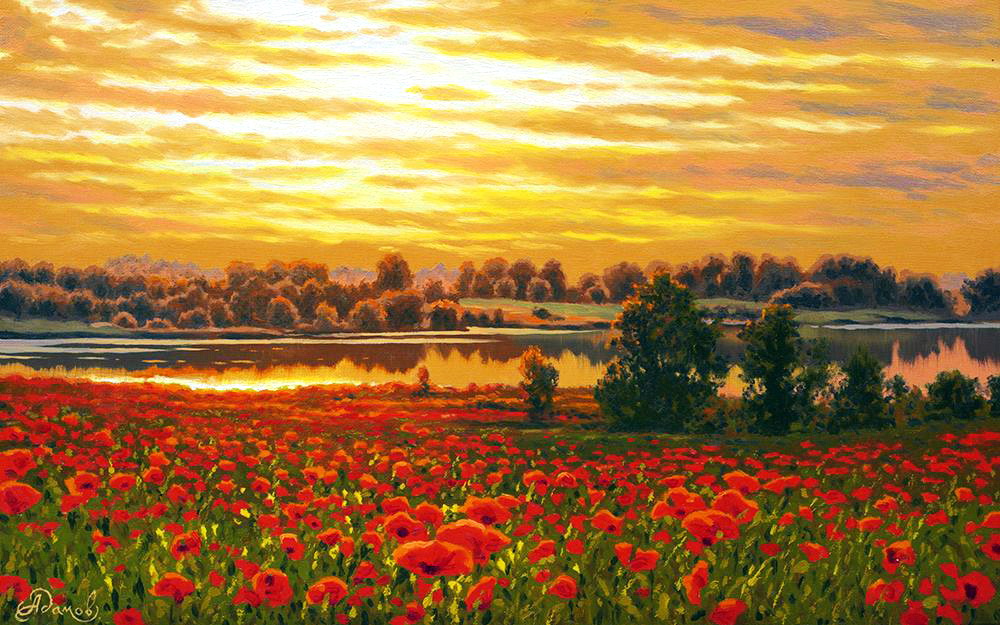 красных маков на закате