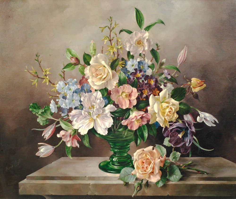 → 66HaroldClaytonBr189679Still life of flowers in a green glass vase