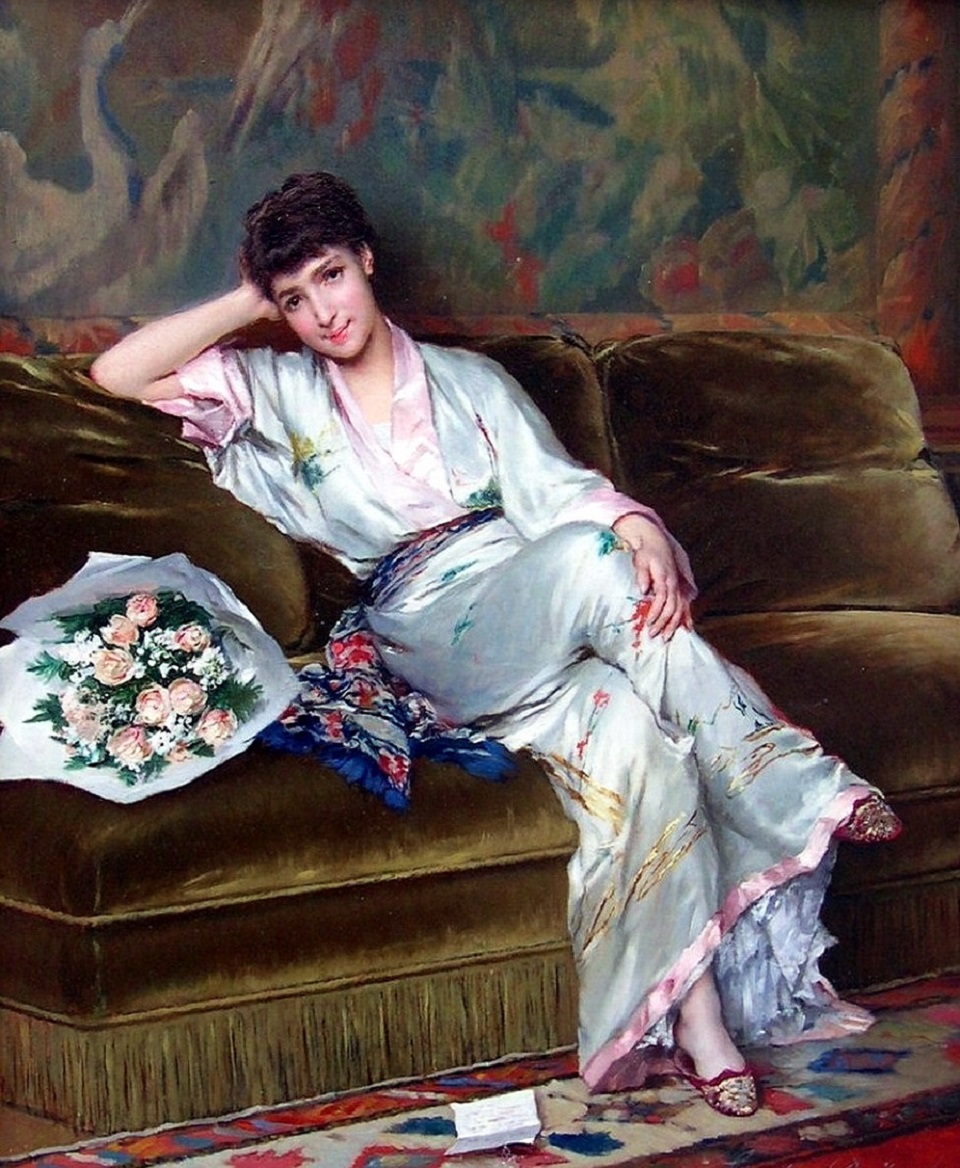 Gustave DE JONGHE Woman with bouquet of roses